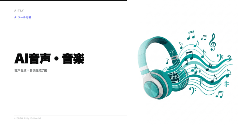 2026年に入り、Sunoの月間ユーザー数は5,000万人を突破し、ElevenLabsは音楽生成にも参入しました。一方でUdioの実質サービス停止やAI音楽の著作権訴訟など、ツール選びのリスクも顕在化しています。この記事では、Aitly編集部が主要7ツールを実際にテストし、音質・操作性・商用利用の可否で比較しました。