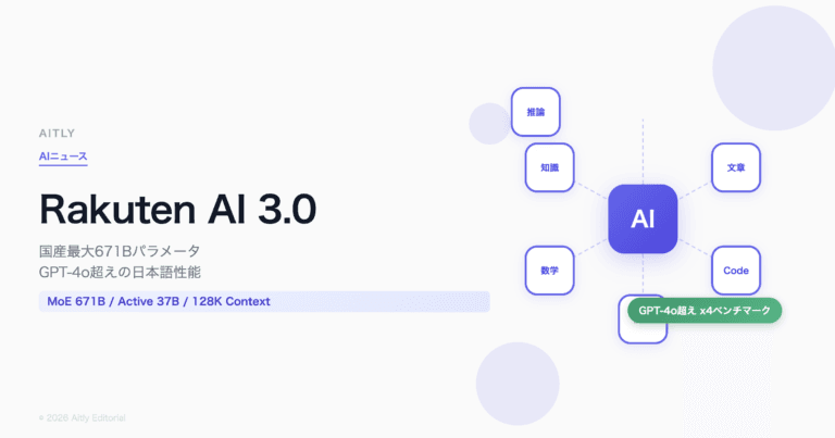 楽天グループは2026年3月17日、国産最大規模のAIモデル「Rakuten AI 3.0」を公式に発表した。経済産業省とNEDOが推進する「GENIACプロジェクト(Generative AI Accelerator Challenge)」の支援を受けて開発されたモデルで、日本語の文章作成・コード生成・文書解析に特化している。