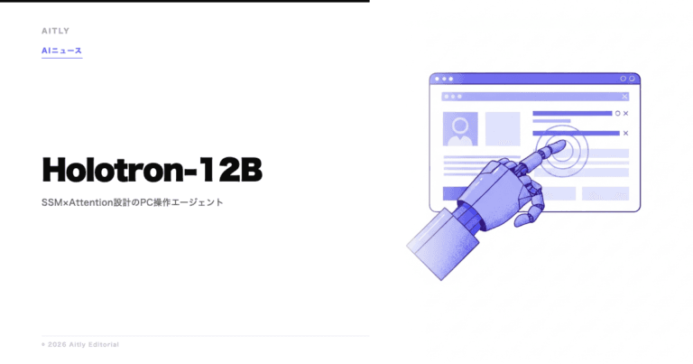 Holotron-12Bは、SSM×Attentionハイブリッド設計で従来比2倍のスループットを達成したPC操作AIエージェントです。単一タスクの精度ではClaude Computer Useに分がある可能性がありますが、大量の並列エージェントを低コストで運用したい企業ユースケースでは独自の価値を持ちます。
