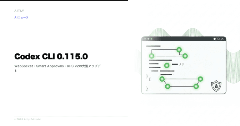 OpenAIは2026年3月16日、AIコーディングツール「Codex CLI」のバージョン0.115.0をGitHubでリリースした。WebSocketによるリアルタイムセッション、Smart Approvalsガーディアン、ファイルシステムRPC v2など、エージェント機能を大幅に強化するアップデートが含まれている。