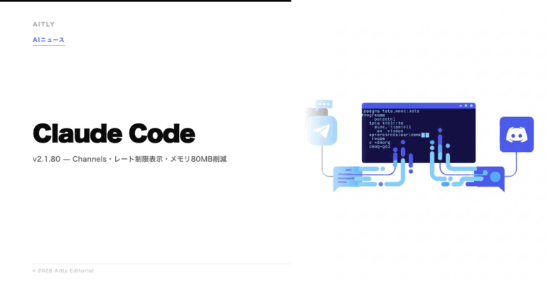 このほか、ステータスラインでのレート制限表示、大規模リポジトリでのメモリ80MB削減、--resumeの並列ツール結果消失バグの修正など、開発者体験を底上げする改善が多数含まれる。本記事ではv2.1.80の全変更点をまとめて解説する。
