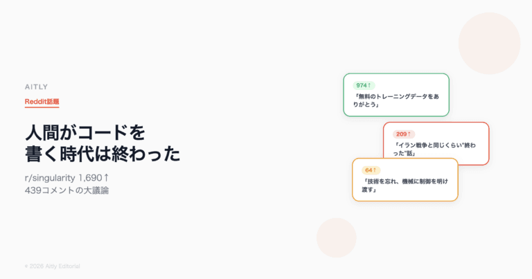 「人間がコードを書く時代は終わった(The era of human coding is over)」。Redditのシンギュラリティ議論コミュニティ「r/singularity」に投稿されたこの主張が、1,690アップボート・439コメントという大きな反響を呼んでいます。賛同する声がある一方、「StackOverflowとGitHubから無料でトレーニングデータを抜いておいてそれか」「コーディングが”終わった”なんてイラン戦争と同じくらい何度も聞いた」と冷ややかなコメントが上位を占めている点が特徴的です。