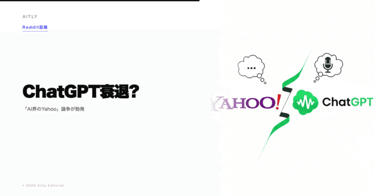 「ChatGPTはAI界のYahooになる」。Redditの r/ChatGPT で投稿されたこの主張が、293アップボート・153コメントの大論争を引き起こした。先行者利益を失い衰退するのか、それとも8億人のユーザー基盤で王座を守るのか。海外ユーザーの生の声を翻訳付きで紹介する。